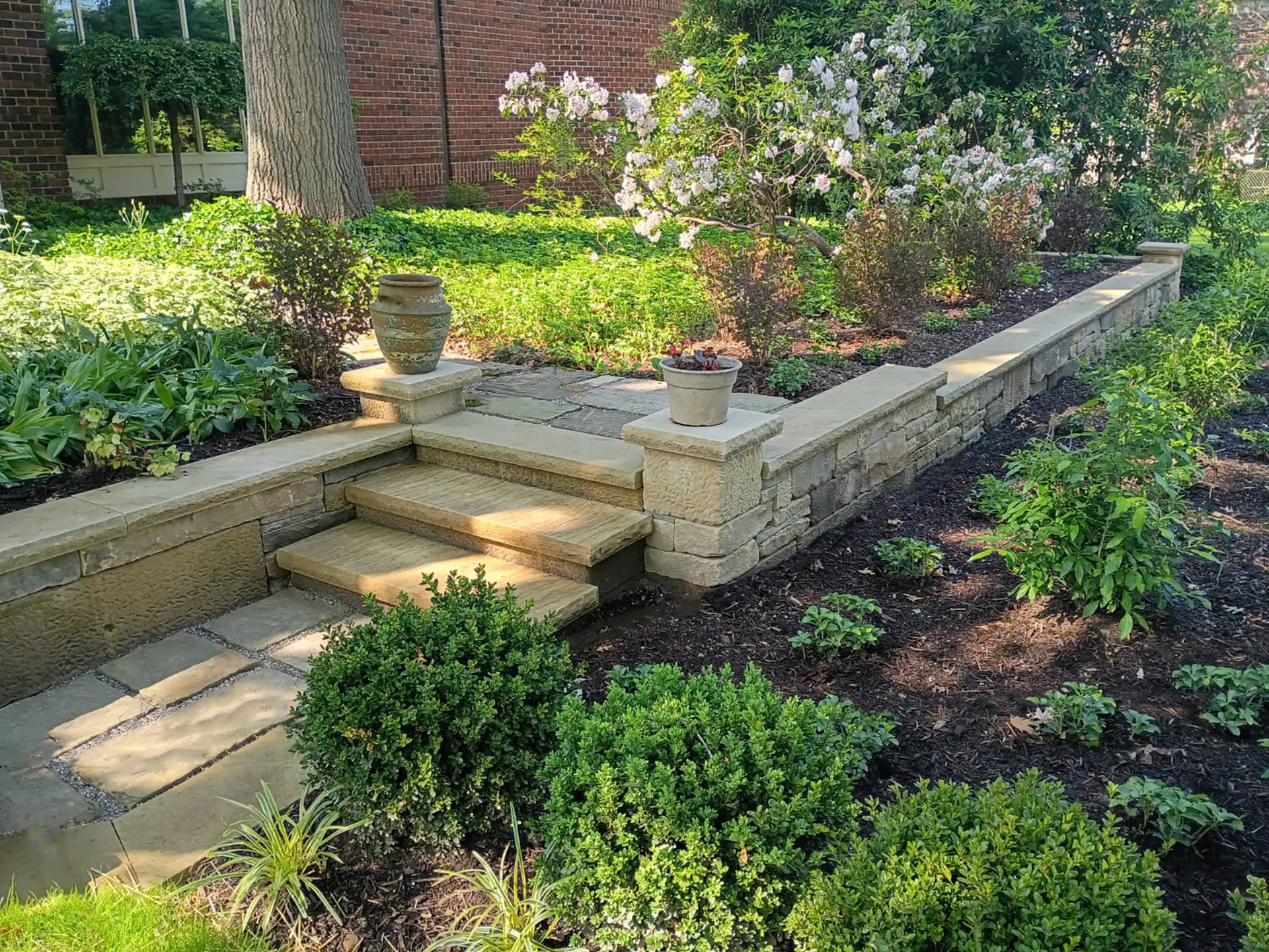 Built new sandstone mix retaining wall and steps in the backyard on gravel base with gravel backfill.