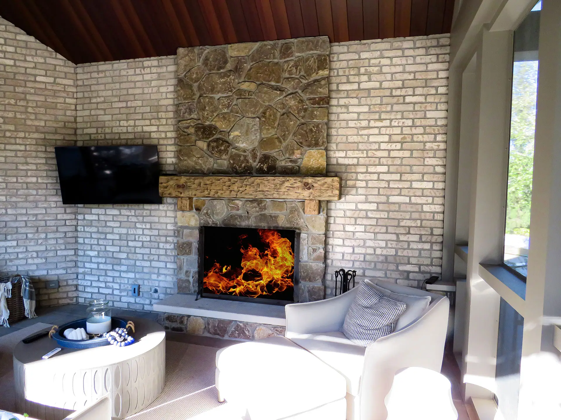 Built new fireplace in screened in porch. Including CMU structure, 4″ Indian Creek Random Stone Veneer and Brick Veneer.