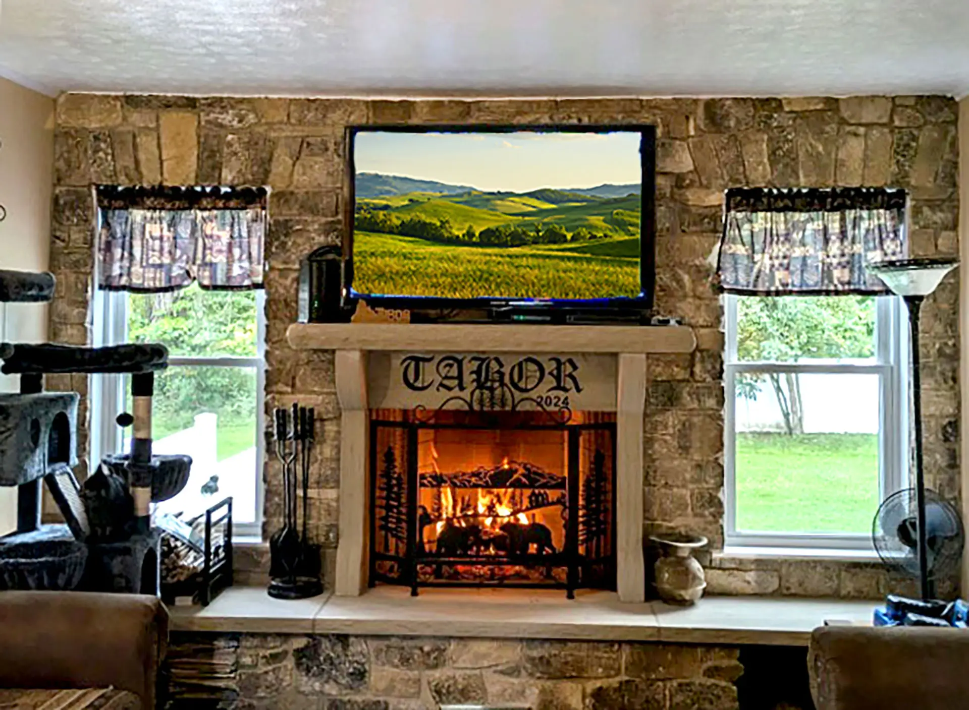 Served as the general contractor, subcontracted out the wood framed chimney and fireplace insert work. Installed Indian Creek Bedface Natural thin stone veneer for fireplace facing with Amhurst buff sandstone fireplace surround. Engraving done by the stone fabricator.