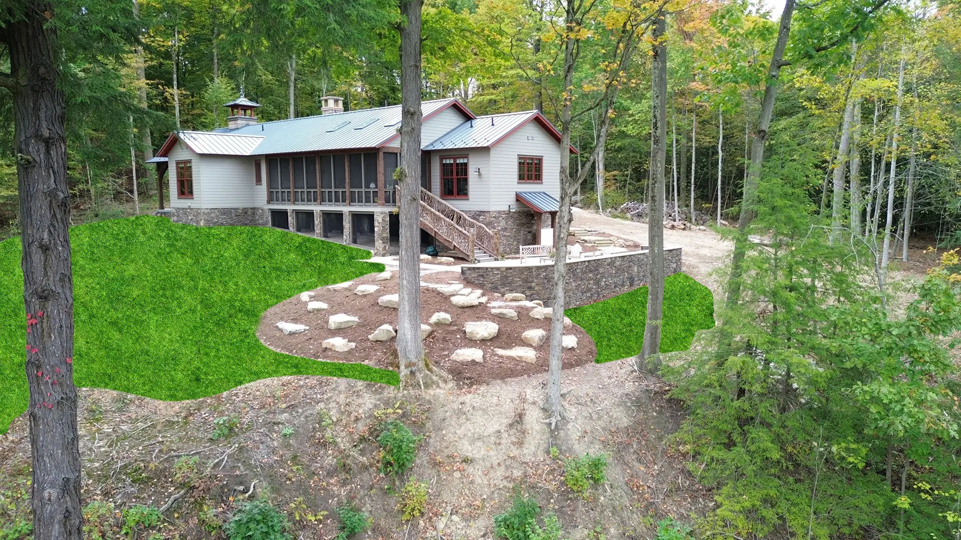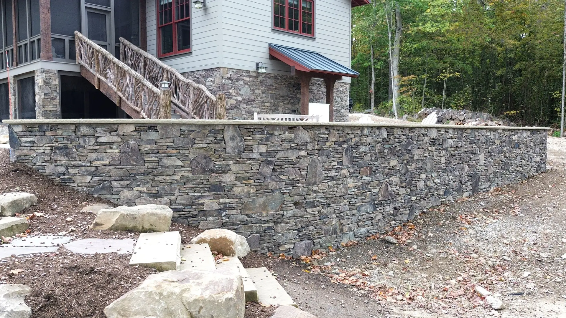 Built new masonry retaining wall including CMU foundation, 4″ moss rock stone veneer and 2.5″ buff Amhurst sandstone caps.